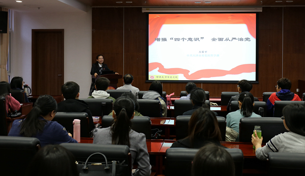 万希平以“增强‘四个意识’,全面从严治党”为主题为党员们上了一堂生动的党课。她结合历史典故和现实实例,从全面从严治党的新时代背景、基本框架和实践指向三方面作了详尽阐述和深刻分析,帮助同学们全面理解“为什么要全面从严治党”“怎样全面从严治党”这一战略布局的重要意义,并就“四个意识”的由来背景、思想内涵、辩证关系等内容进行了梳理。她提到,全面从严治党关系到民族复兴的伟大中国梦的实现,是一场“人心之争”和意识形态的较量,作为党员,须时刻律己,努力做到提高党性修养、保持党性纯洁、坚持奉献精神,发挥时代的引领和示范作用。