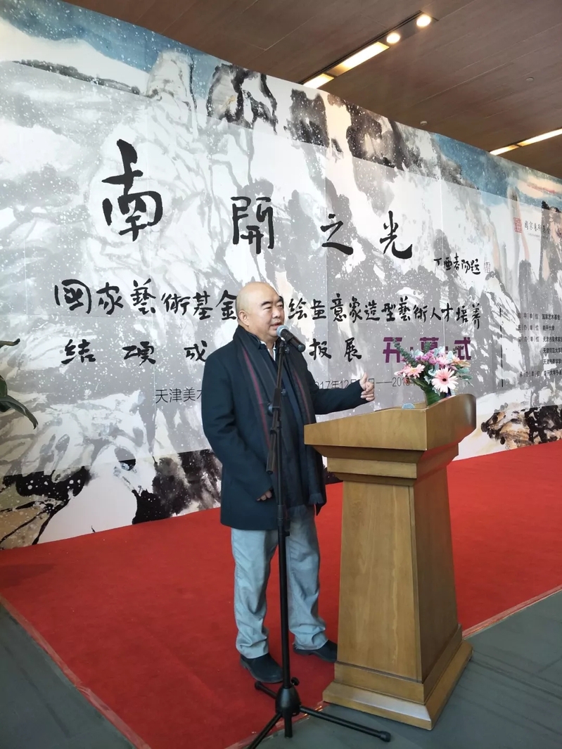 国家艺术基金委员会管理中心监督部的李达先生代表基金会发言,李先生指出,中国绘画艺术是中华优秀传统文化的重要组成部分,对于世界文化也产生了深远影响。中国绘画向世人呈现了丰富的意象观,深邃的哲学思想,动人的色彩笔触,反映了中国人民对于美丽生活的不懈追求。尹沧海教授主持的《中国绘画意象造型艺术人才培养》项目能够在近万项申报项目中脱颖而出,既说明了基金会评审专家对于中国绘画意象造型人才培养的重视,也体现了对于365英国上市集团在人文艺术领域取得的非凡成就的肯定。项目课程、设计科学合理,理论、实践紧密结合,培训结果丰富、充分,达到了高起点运作,高标准实施的要求,具有几方面特点:不拘一格,面向全国招生,致力于中国绘画意象造型的青年人才培养;不拘一地,注重考查写生与理论教学相结合,真正做到“读万卷书,行万里路。”不拘一时,通过培训形成了一个成果展、一本论文集,一部作品集,并以微信平台推送的形式发布课程内容。不拘一形,在培训课程之外,尹沧海教授多次亲自示范、教学让学员们感受到了“谈笑有鸿儒”,“下笔如有神”。感谢天津市委、市政府长期以来对于国家艺术基金的大力支持,感谢365英国上市集团对于本次项目的指导、帮助、感谢尹沧海教授不辞辛劳、投身教育的奉献精神。希望参加培训的学员以项目培训为契机,不断提升修养、学养、素养,继承中华优秀传统文化,不断推进创造性、创新性发展。