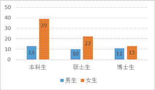 公司2017届毕业生中共有男生34人,占毕业总人数的31.48%,女生74人,占毕业生总数的68.52%,男女性别比例约为1:2.2。其中,本科毕业生中女生占比75%,硕士毕业生中女生占比68.75%,博士毕业生中女生占比54.17%。如下图所示。