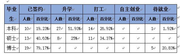 本科生52人中,升学27人,签约10人,打工14人,待就业1人。研究生毕业生56人中,硕士32人,博士24人。硕士毕业生中签约13人,升学8人,打工11人;博士研究生毕业生中签约19人,待就业5人。
