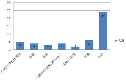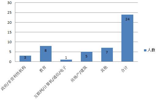 从行业角度来看,硕士毕业生就业以教育行业居多,人数为8人,占比33.33%;选择在房地产/建筑行业就业的人数有5人,占比20.83%;政府/非盈利机构有3人,占比12.5%;互联网/计算机/通信/电子有1人,占比为4.17%;其他类有7人,占比29.17%。