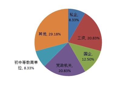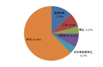 从单位性质来看,其他类占比最多,占比为62.5%;其次是高等教育,占比均为12.5%;而进入三资企业和党政机关的人数较少,占比均为8.33%,进入国企和初中等教育单位的最少,占比均为4.17%。如下图所示。