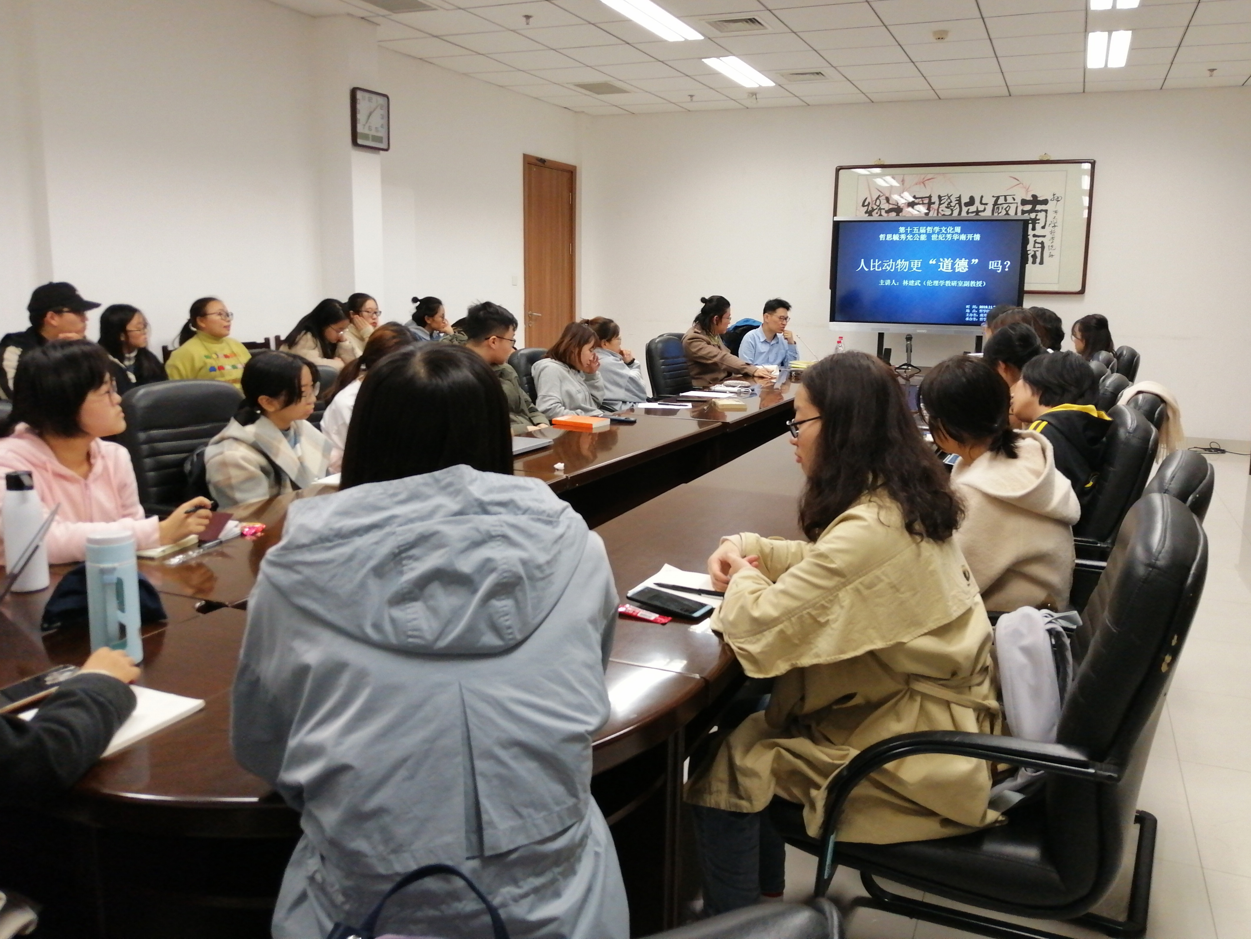 林建武将主题分为两个部分,引入思考:一方面,他由动物是否具有道德的疑问出发,列举了吸血蝙蝠、黑猩猩等探讨了动物的道德性问题,即有关动物权利问题的争论。另一方面,为追寻人的道德的起源问题,他自进化论的观点出发,阐述了道德的形成的过程,即从人的自私的自我保存到社会关系中的互惠性的转变过程。他指出人的道德感为建立道德规范的有序性提供帮助,进而引出同学们对“道德对于人来说究竟意味着什么?”这一问题的讨论。