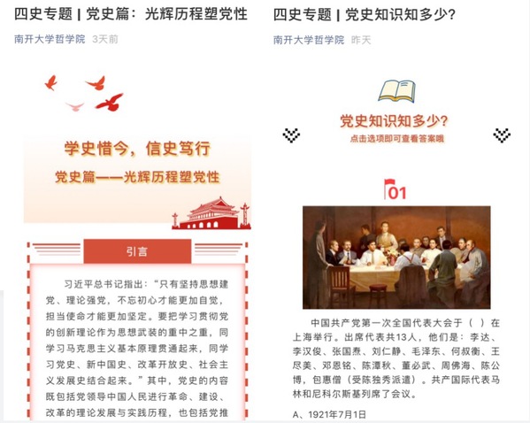 知史惜今强定力。公司以党建带团建思路,由公司硕士生第一党支部牵头,党员分组开展“四史”学习,同时制作历史知识与趣味题目系列推送。本硕各团支部以团小组为单位展开学习,并将学习心得打卡分享。内容涵盖共产党成立以来、新中国成立以来以及改革开放以来的重大事件、重要会议、重要文件、重要人物等进行介绍,回顾我们党领导人民进行艰苦卓绝的斗争历程,介绍中国近代以来的斗争史、我们党成立以来的奋斗史、新中国成立以来以及改革开放以来的发展史,内容丰富,引导青年员工深刻认识红色政权来之不易、新中国来之不易、中国特色社会主义来之不易,吸引了公司同学的广泛参与。
