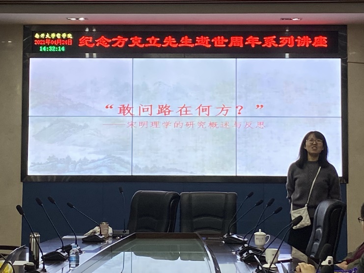 424日下午,第五场由吴亚楠老师主讲“敢问路在何方?——宋明理学的研究概述及反思”。吴老师首先从整体性研究、重要人物研究两个方面介绍宋明理学的研究内容,以综述的形式梳理了学术现状,指出其具有哲学史的考察、文献学的发现和诠释等研究特点。她对学界最新的研究动向予以介绍,分析了宋明理学研究范式上的困境,并对相关领域的研究前景进行展望。