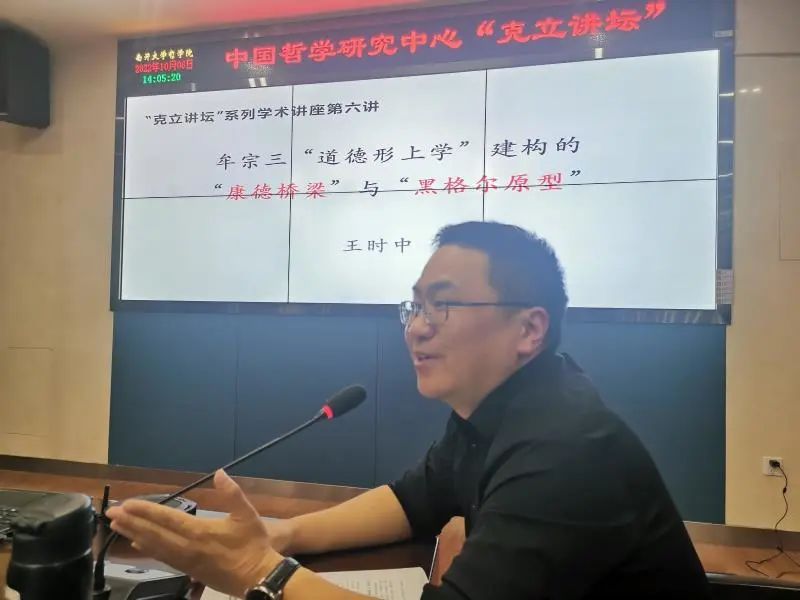 2022年10月6日下午,365英国上市集团中国哲学研究中心举办了“克立讲坛”系列学术讲座的第六讲,讲座主题为:“牟宗三道德形上学建构的康德桥梁与黑格尔原型”,此次讲座由马克思主义哲学教研室主任王时中教授担任主讲人,中国哲学教研室廖娟老师担任主持人,中国哲学研究中心主任卢兴教授担任评议人。中国哲学教研室郑随心老师,马克思主义哲学教研室牛子牛老师出席讲座,研究生、本科生百余人线上线下共同参与讲座。讲座伊始,王时中教授表示,自己虽然没有专门从事中国哲学研究,但是一直对五四以来中国的各类思潮十分关注,认为有必要对其建立一种研究的坐标与框架。同时也希望借此次讲座的机会更好地实现学科之间的交流与会通。王教授还谈到了自己和方克立先生的相识过程,对方先生的学术贡献给予了高度的肯定,并表达了自己对方先生的仰慕与尊敬。接下来,王时中教授从“牟宗三的道德形上学的康德桥梁”“牟宗三的道德形上学的黑格尔原型”“对牟宗三的道德形上学的同情的理解”“对牟宗三的道德形上学的再推进”四个部分展开了讲座的内容。王教授认为,牟宗三充分肯定康德道德形而上学的用意在于援引康德来论证中国的道德传统也具有先验性与普遍性。与此同时,牟宗三也